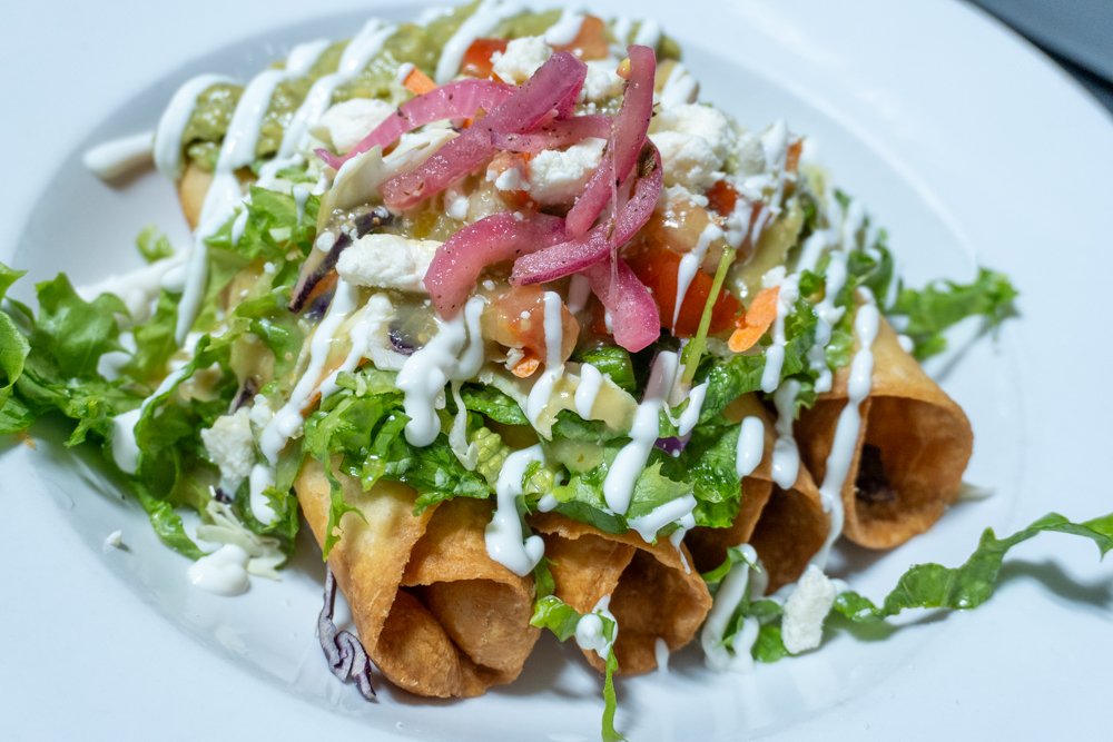 4 pieces deep fried Flour tortilla filled with chicken or pork, topped with lettuce, touch coleslaw, guacamole, fresh salsa, sour cream, feta cheese and our famous tomatillo Guerrero style green sauce.
